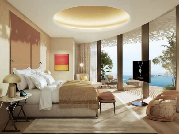 The penthouses boast opulent features, including a dedicated lift lobby for an impressive entrance, a show kitchen for special occasions, and a wet kitchen for everyday use. A wrap-around terrace provides breathtaking 360-degree views of the skyline and open sea. The sky villa, perched at the top, provides the epitome of statement living with a private pool and lift access. The Bulgari Yacht Club, inspired by the Mediterranean charm, features a 46-boat harbor, Italian restaurant, member’s lounge, outdoor pool, and a kid’s club. Residents can also enjoy the 50m long horizon pool surrounded by a spacious lounge.