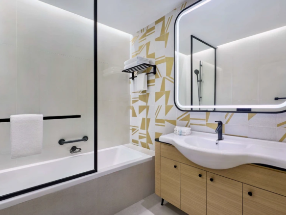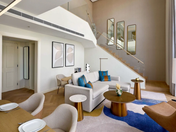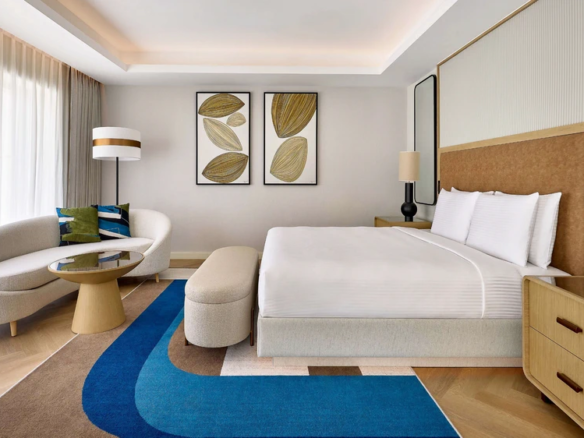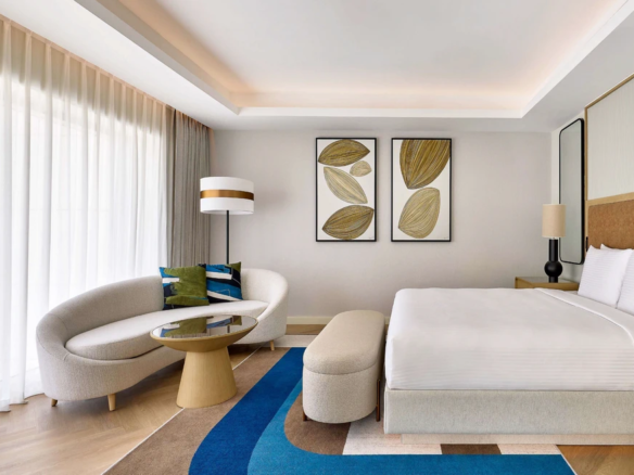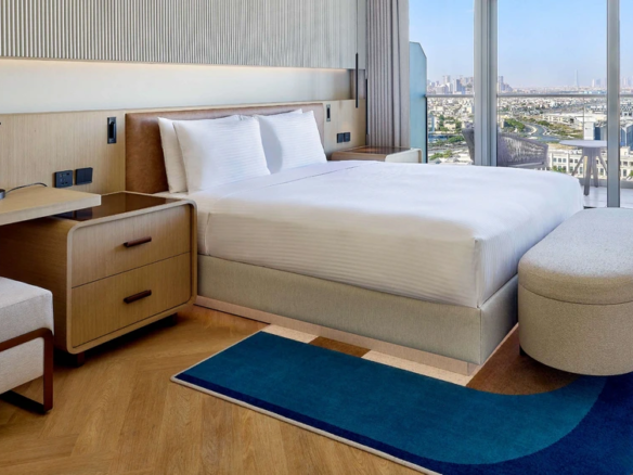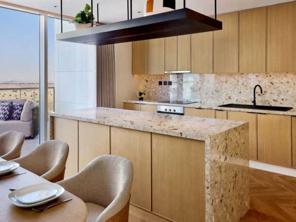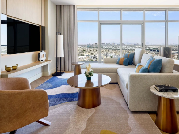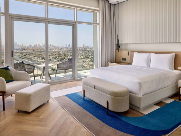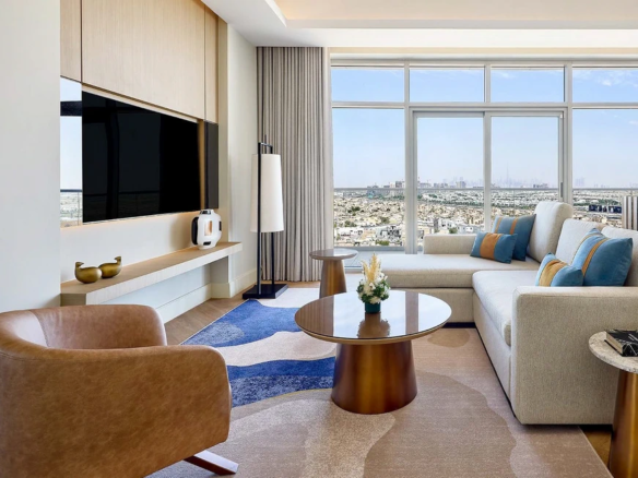 At Marriott Residences Al Barsha South, Dubai enjoy Panoramic views of Burj Khalifa and Burj Al Arab. Located in the vibrant Al Barsha South, the residences are designed as a serene retreat from city life. The interiors blend green and beige tones with subtle arabesque accents, creating a warm, modern aesthetic.