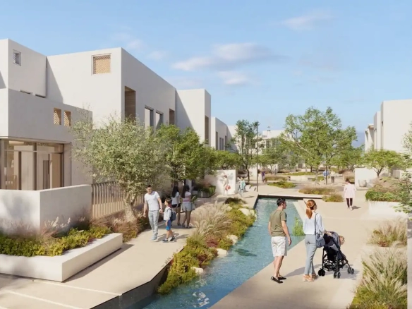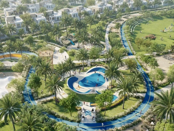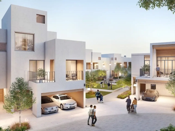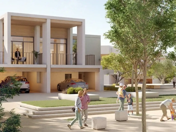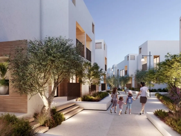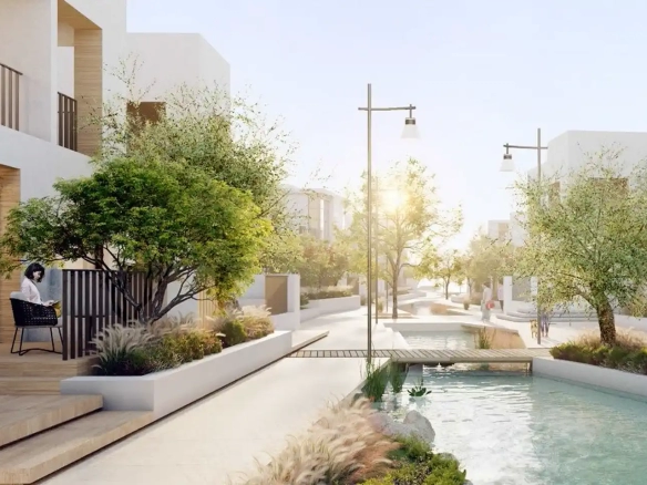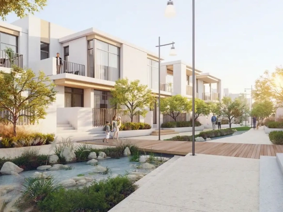 Bliss is the first ever urban village with whitewashed and neoclassical townhouses in Dubai that has a sustainable design, and was inspired by real estate in Santorini. The area has cobbled streets and winding paths that bring the complex together.