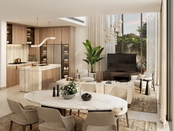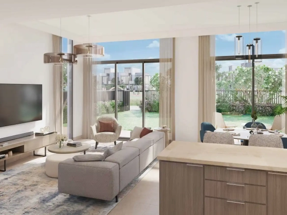 One of the latest phases in the community is Mudon Al Ranim 7 with areas of townhouses ranging from 2,345 to 3,004 sqft. Residences offer unobstructed views of the green lushes thanks to floor-to-ceiling windows. A copper beige colour palette is used in the design of the residences. Double volume space makes units look airy. Enough storage space and high-quality appliances can be seen in the kitchens.